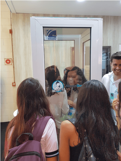 Nossa cabine acústica permitiu que os visitantes experimentassem de perto o isolamento das janelas e portas antirruído da Atenua Som, ao entrar e tentar se comunicar com quem estava do lado fora.